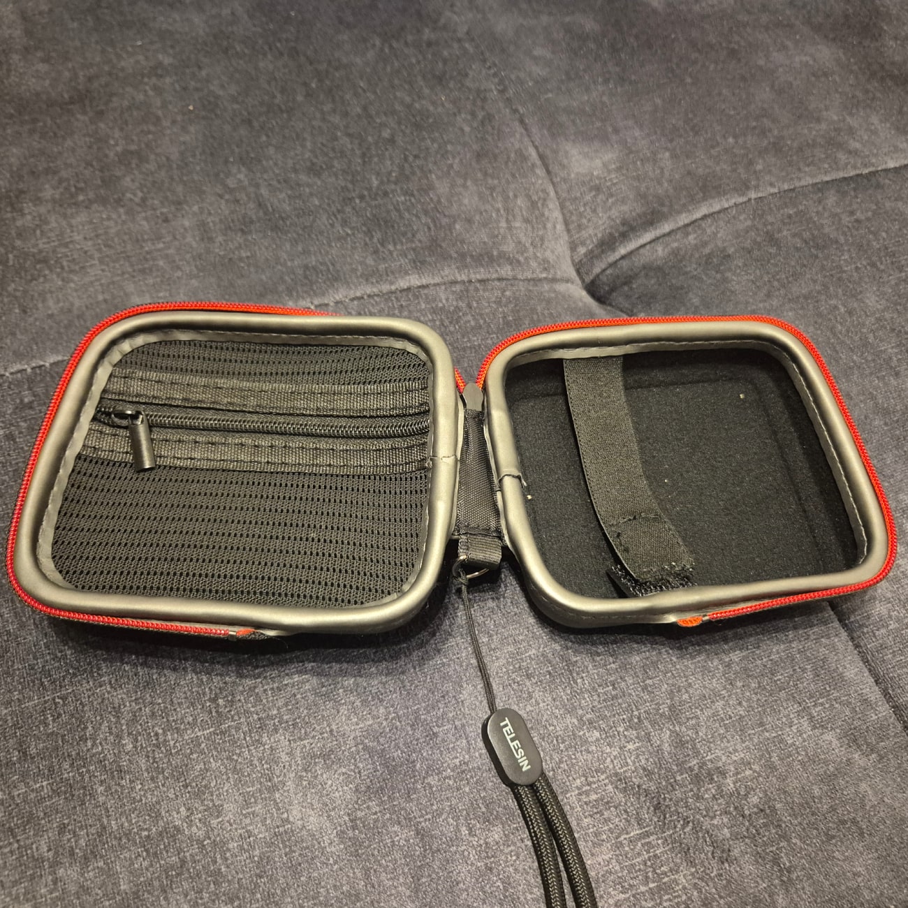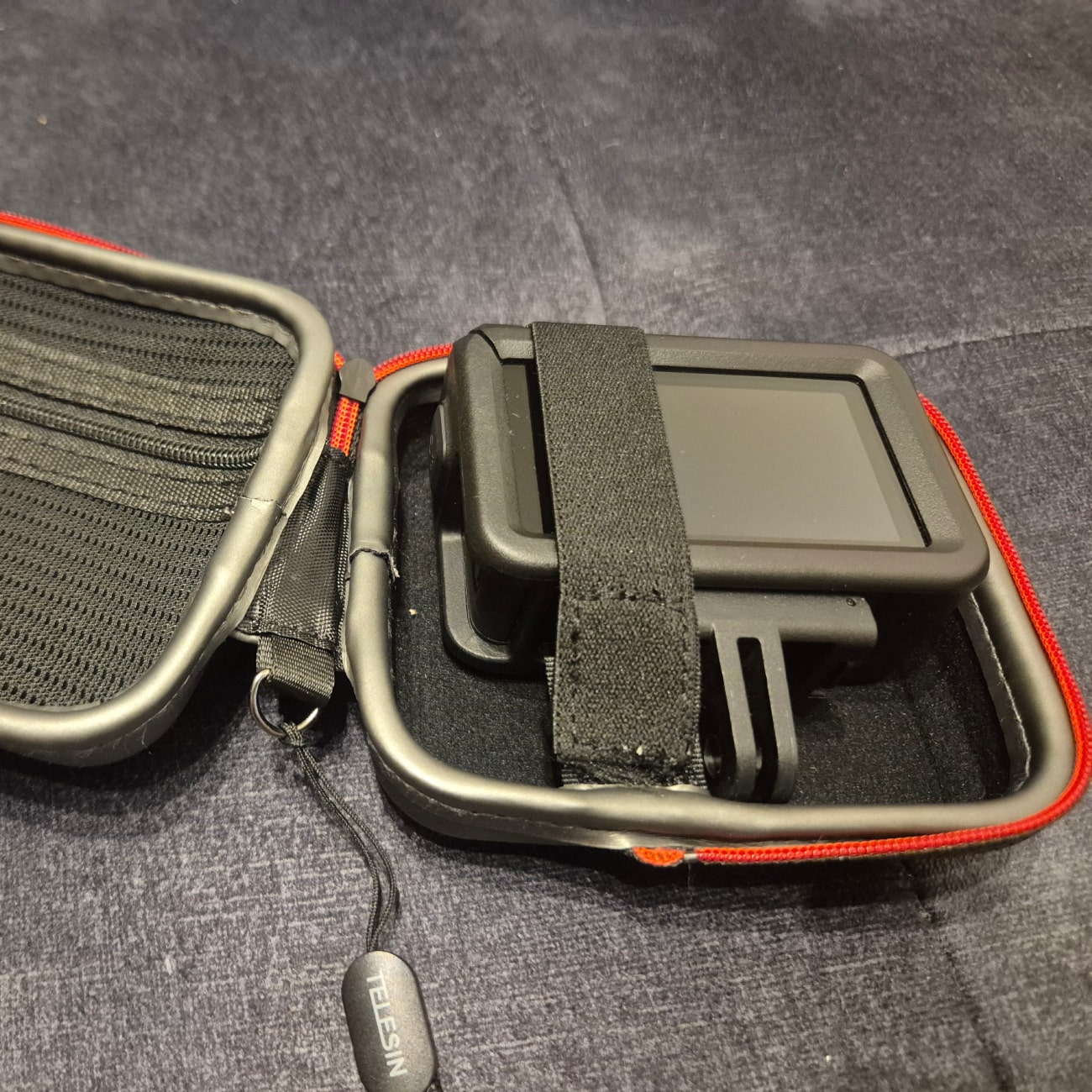 Viduje yra kišenėlė su užtrauktu susidėti smulkius aksesuarus. Kita dėkliuko pusė yra apsiūta minkšta ir švelnia medžiaga, kad nesusibraižytų kamera, o kad kamera nejudėtų dėkle, tai pasinaudokite esančia tampria juostele, po kuria kamera laikysis nejudėdama.